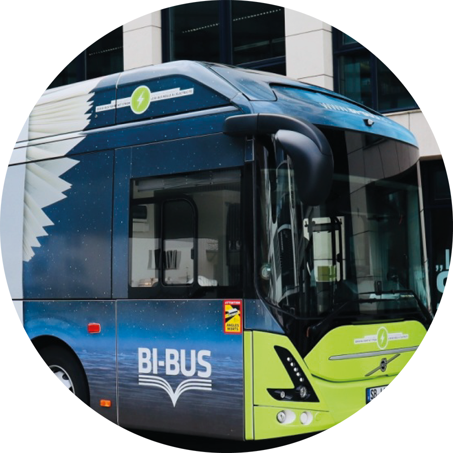 Le BI-BUS intervient auprès des écoles primaires dans les communes et territoires de l’Eurodistrict SaarMoselle avec son stock de livres et autres médias offerts au prêt. C’est un bus que l’on reconnaît entre mille, avec un credo : la culture qui vient à nous.