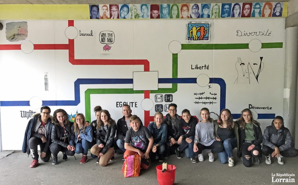 Ils imaginent une sorte de plan de métro, avec différentes stations évoquant des valeurs « qui leur paraissent importantes ». Celles de la France, évidemment, mais aussi d’autres, qui ont donné lieu « parfois à des débats quasi-philosophiques », lance Pierre Oswald. Le travail, la laïcité, la diversité, l’unité… « Pour chacune d’entre elles, il fallait qu’ils essaient de trouver une illustration », ajoute Armelle Thomann. Façon street art, et pourquoi pas en français, en anglais et en allemand. « Le souci est que pour certains mots, il n’y a pas d’équivalent… » Laïcité par exemple, un concept qui semble totalement étranger à nos voisins d’Outre-Manche…